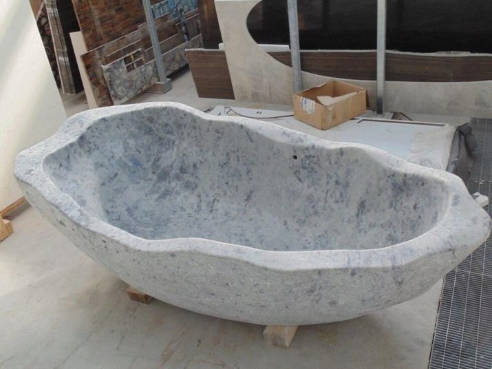 The color palette of bathtubs made of natural stone cannot boast a wide variety. For example, you can consider the well-known marble. To make the structure, a block of appropriate sizes is taken, a bowl is cut out inside, the sides are processed to emphasize the richness and decorative component of the room.