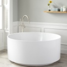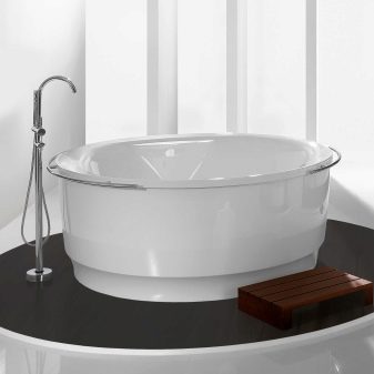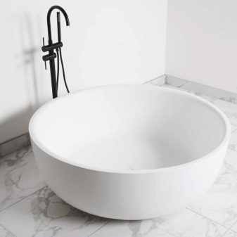 The vast majority of round bathtubs on the market are made of acrylic. The popularity is explained by its low cost, the absence of the need for special care, the ability to retain heat and lightness of the material. In the presence of a partner, such a bath can be raised to any floor, even without any tools.