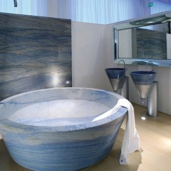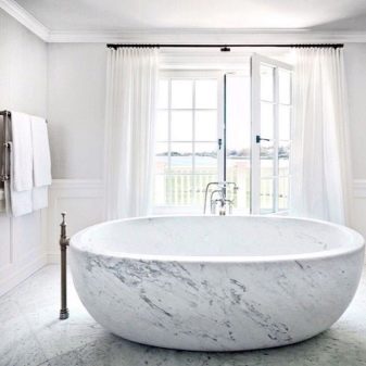 If the budget is not limited, then you can buy in a bathtub made of natural stone. Similar items are made made of marble chips and are distinguished by large dimensions, weightiness and high cost. Such models require special care, but can serve for a very long time.