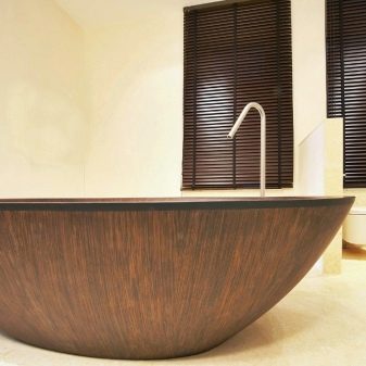 Bathtubs made of glass and natural wood are most often purchased by lovers of exotic. Glass models look rather unusual, but modern and almost always arouse admiration of the guests. Many manufacturers produce such solutions to order, and future owners can choose the right accessories and the right color. However, before going to the store, it should be borne in mind that such products are very expensive, as they are made of heavy-duty tempered glass.