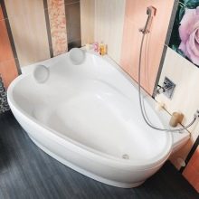 Designers claim that corner bathtubs are ideal for small-sized rooms for hygiene. Ordinary plumbing can simply clutter up the room, and a shower cabin can not replace a good rest in the font.