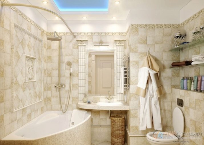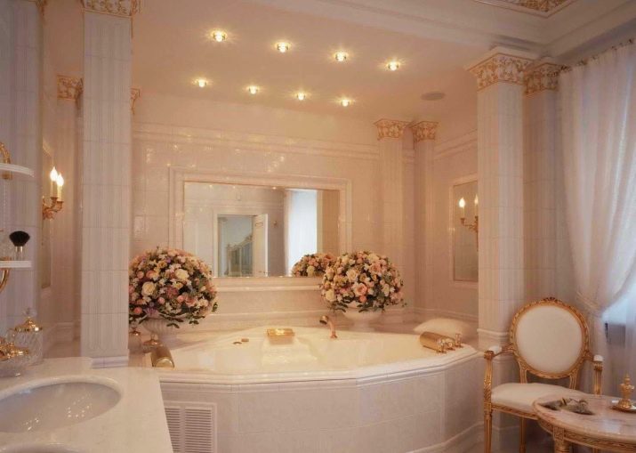- Looks luxurious corner piece in a spacious empire style room. Designers recommend choosing a light tile that frames a rather big bathtub, the side of which is also decorated in the same shade.