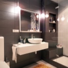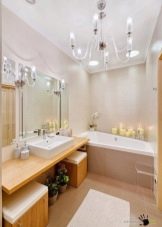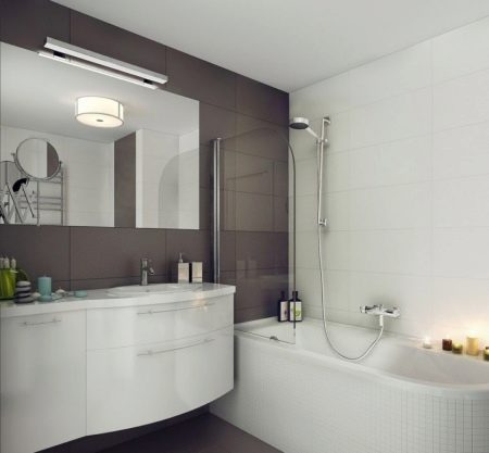 Lighting devices must be waterproof and reliable. Depending on the chosen stylistic solution, this can be a built-in spotlight type on the perimeter of the bathroom, a central lamp, wall sconces. The last type of illumination is placed near the mirror (above it or on its sides).