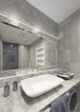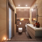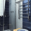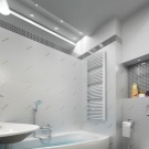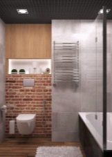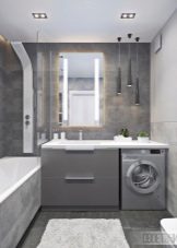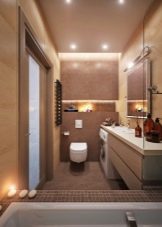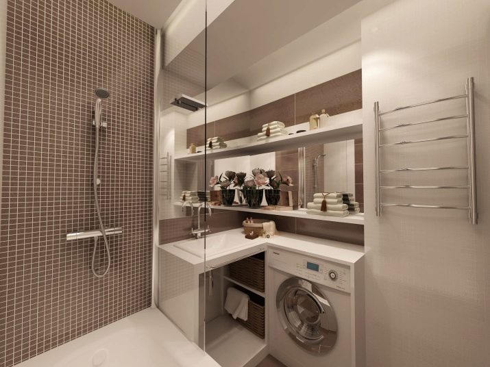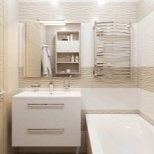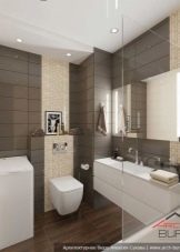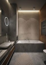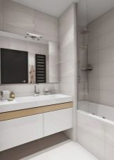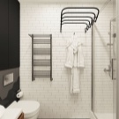 You have to build on the location of the communications node. The bath and sink are placed as close to it as possible to avoid unnecessary visual stress in the form of stretching pipes. Heated towel rails are located near the bathtub. If it is equipped with shelves and hooks, it can be used as a hanger for bathrobes and towels.