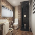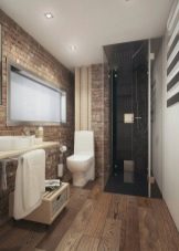 - The contrast of brick and wood texture in the decoration of the bathroom.