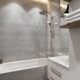 Separation in a small space will be conditional. There is not enough space to create full-fledged partitions or screens. However, for example, a washing machine or a cupboard, a basket for dirty laundry can become a conditional partition. The glass door of the shower can become a fencing element.