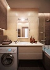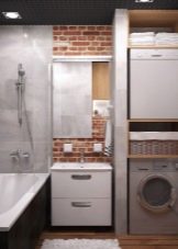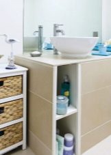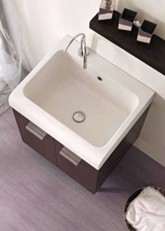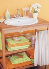 The washbasin table can have both open and closed storage systems. Depending on the design, it will be possible to mount in it not only a washing machine, but also hide a laundry basket. If a space is provided for the machine on another wall, you can buy a hanging model with cabinets for the washbasin. The countertop can be used for storage of detergents.