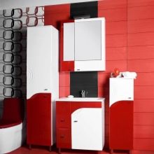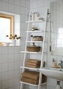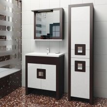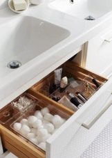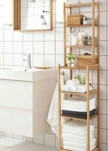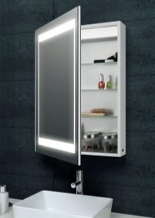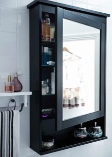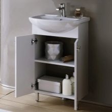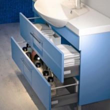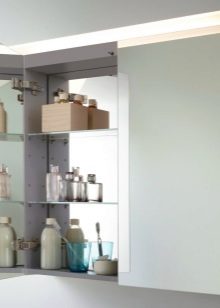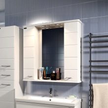 You can hang a shelf above the sink with a mirror in the form of a compact hinged cabinet. Depending on the type of furniture, it may have a different opening / closing mechanism. Drawers can be retractable or retractable. There are models in which the shelves are extended to the sides.