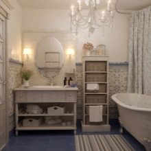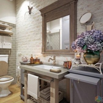 Country and Provence create with the illusion of being in an old house. If a washing machine is provided for in the project, it is masked with cabinet doors. Walls are made out under a painted board using slats with imitation of wood texture. They create false balls on the ceiling, select accessories in the old style (bottles for shampoo, gel, jugs).