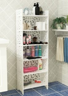 If the room does not have a niche, and the layout does not allow you to install a chest of drawers or a spacious cabinet, you can do with a high rack. The design of the product, the number of tiers of shelves, fences are selected so that the furniture is in harmony with the overall style.