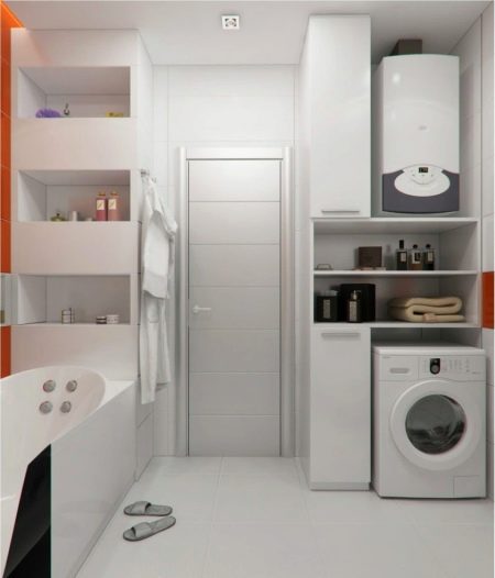 Depending on how the plumbing is installed, it will be possible to fit floor and wall cabinets in the bathroom. Floor-standing are good for masking the washing machine, which allows you to visually ennoble the space. Wall-mounted can make up certain compositions coupled with cantilevered shelves.