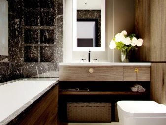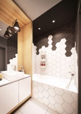 Another option involves the use of a two-tiered composition. Inexpressive seemingly wooden elements immediately attract attention. The authors of the concept, as in the previous case, skillfully woven spotlights into the overall composition. A nice addition to the interior are green plants. Most of the walls and floor are tiled - which gives the designers a craving for impeccable conservatism.