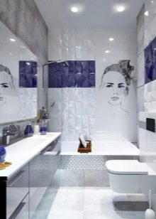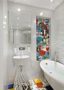 It is useful to study the creations of designers who have reached the pinnacles of excellence.The photo shows how beautiful a bathroom with built-in appliances will look. The harmonious fusion of white surfaces and mosaic elements looks very good. The stretch ceiling with spotlights fits into the resulting composition as attractive as possible. It also uses local lighting on the wall.