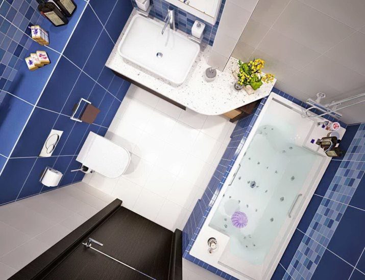And here it may look like a top view of a small bathroom. Designers deliberately used the contrast of saturated blue, graceful black and light gray. A rectangular bathtub and a curbstone with a beveled angle look very attractive. Despite the fact that it is a combined bathroom, it is impossible to call it “typical” or “boilerplate”. Freshness and harmony reign in the whole atmosphere.