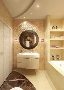 - The use of plumbing in round shapes and contrast in the decoration of the room makes the interior modern. It is very beneficial that a special niche is provided for the washing machine, glass shelves above it also add convenience. The high mirror above the sink makes it possible to use it by all members of the family - both children and adults.
