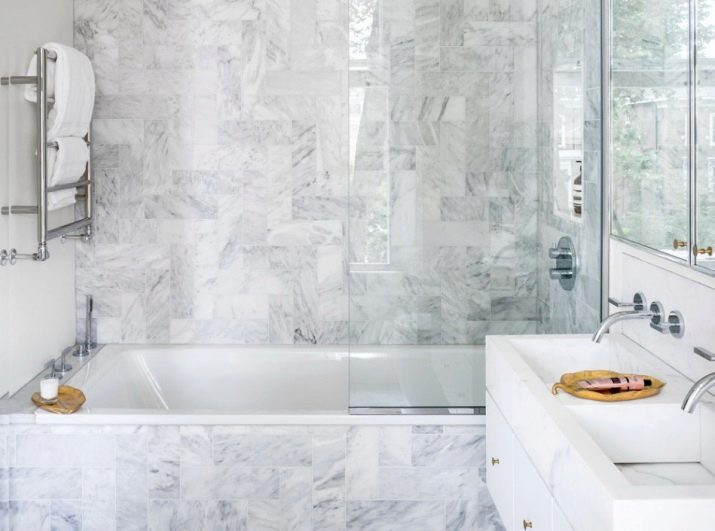 - “Marble” finish of the bathroom with an area of only 3 squares makes it easy to feel in such a room. Even a cramped room is perceived as part of a solid spacious house.