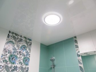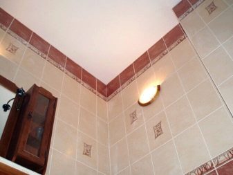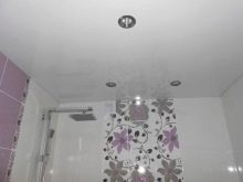 Stretch ceiling it is increasingly used in the decoration of bathrooms, including the minimum in size. Usually choose the option with a glossy surface that creates the impression of a three-dimensional space. The advantage of the design is that it is easy to wash. It is recommended to use this finish in rooms with good ventilation. If there is a flood in the house, it will take the whole blow, but after the water is drained, a fungus can develop under the ceiling itself.