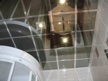 A mirrored ceiling in a small bathroom is a good solution, as it significantly expands the space. Moreover, this design is resistant to moisture, easy to install, even if the "native" ceiling is uneven. However, there are difficulties in caring for a mirror coating, as with any mirror. It is not easy to get rid of stains on it, especially taking into account the fact that you have to keep your hands up for a long time while cleaning, which is very tiresome.