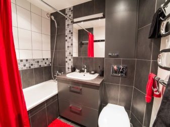 When decorating a miniature bathroom, you can take two tones of one auxiliary color or just use paired colors, for example, blue and blue. At the same time, the contrast of tones in a limited space has the right to exist, however, the contrast should not be deliberate, and there is not too much bright tone. For example, elements of red color on a white base will make the bathroom stylish, if not sorted out with the number of bright inclusions.