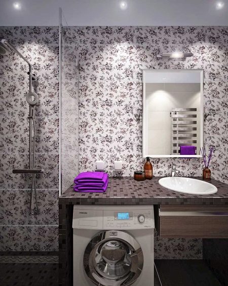 - Finishing in gray tones is not at all boring if the walls are in a small pattern. This is just what you need for a small bathroom. The design under the mirror successfully combines a sink and a washing machine.