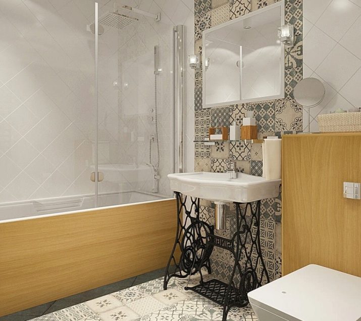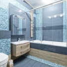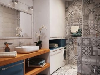 Along the opposite wall, you can place a shower, washbasin, cabinet and washing machine. Above the bathtub you can make a small niche for detergents. If there is enough space near the sink, here you can also build a niche by removing the washing machine and boiler.