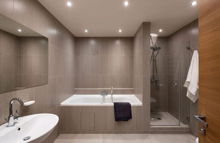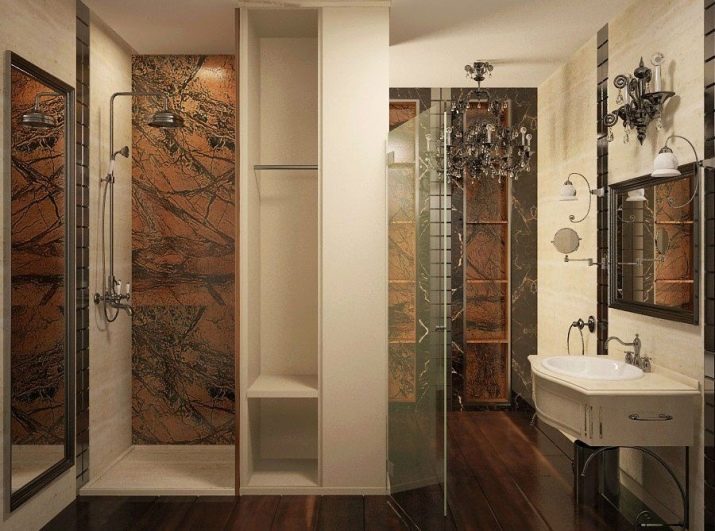 The combination type option has a deep pan. You can use such a cabin as a shower and bath. The rest of the place can be reserved for convenient hinged shelves or a rack, heated towel rail. The coil can be located near a niche with shelves. A washing area with a mortise sink is located nearby, a large mirror is mounted on the wall opposite.