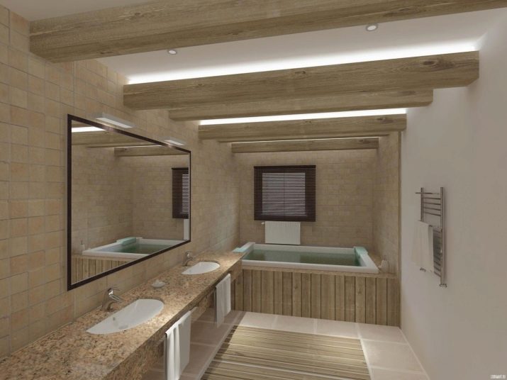 Lighting devices select based on the specific style of the interior. Also take into account the height of the walls, the location of the "dry" and "wet" zones. The backlight can be general and local. The central lighting device can be spotlights, a chandelier, a panel, an LED strip. The tape can illuminate the ceiling, shelves, niches, shelving, bathtub, mirror, furniture. To illuminate the wash zone, you can buy wall sconces of vertical or horizontal type. Their position can be symmetric and asymmetric.