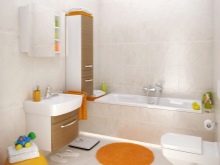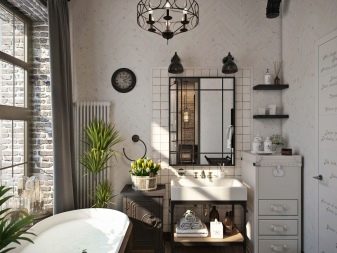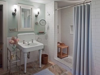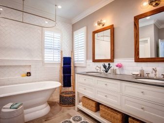 Laundry baskets are sometimes mounted in niches or existing furniture. Trash bins are placed under the sink. If a small bathtub is equipped with a screen, detergents and other things are hidden there. Floor heated towel rails are placed in the bath area, wall-mounted analogs are mounted in small rooms, placing them in a wet or dry area (near the bath or mirror).