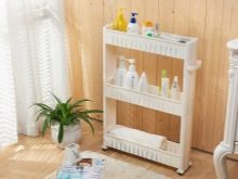 Corner shelves with a stand are placed not only in the shower, but also in the wash basin. So you can free up space on the countertop by buying a large sink for it or adding a table mirror. Small items cleaned by the organizer will visually unload the space. So the room will seem cleaner and more spacious.