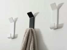 The type of hook installation is different. They are mounted on self-tapping screws, Velcro, mounted in a hidden way. Depending on the variety and purpose, they are mounted on a wall in the wash zone, on a cabinet near the wash zone. Of all the options Velcro is considered unreliable (raw steamed air deforms Velcro very quickly).