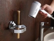 Thanks to the holder it is possible to save space in the mirror area. The design and functionality of the accessory vary. It can be simple or supplemented with compartments for curling, ironing, comb. Despite the cost, a hairdryer holder is in almost every bathroom.