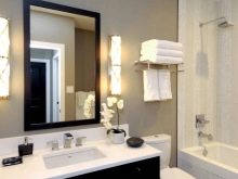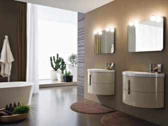 When arranging accessories, you need to remember safety. Arrange objects in such a way that they do not interfere with free movement. A mirror is usually placed above the sink. Its backlight should be placed at a sufficient distance from wet areas. If there is space under the washbasin, you can fit a waste basket there.