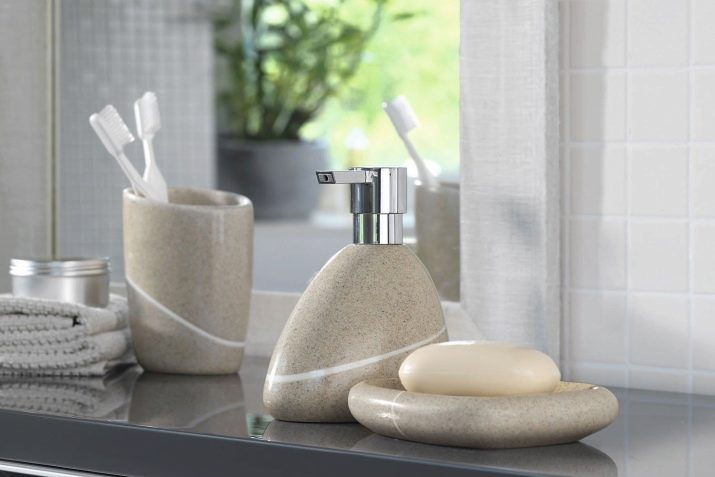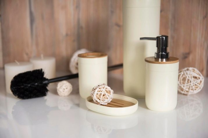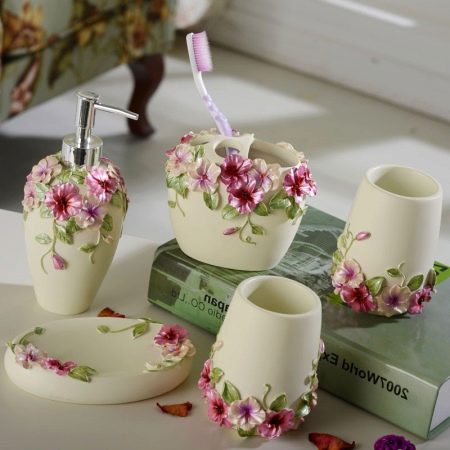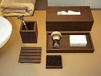 This group includes containers for storing combs. Sometimes in bathrooms, adapted for living quarters, on tables or shelves, you can see vases and figurines. They are selected in order to enhance the recognition of a particular style. So that they look expressive and do not overload the interior, their quantity is dosed. Table-type accessories are presented in stores both as single products and as sets.