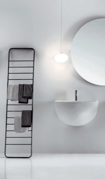 Models on rings and bars are practical and stylish. They are laconic and extraordinary, due to which they are great for decorating bathrooms in different styles. The number of crossbars can be different, which allows you to dry several towels on them at once.