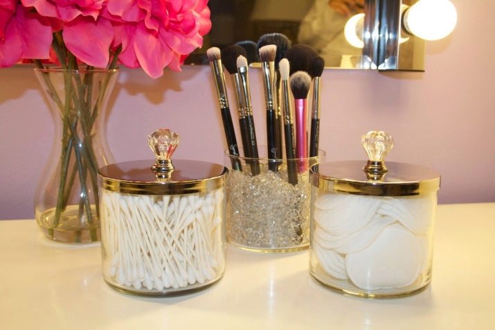 Glass goes well with any material used in the bathroom.Glass vases, glasses, caskets are not afraid of moisture, fumes and fungus. Their main drawback is the demand for care.