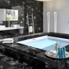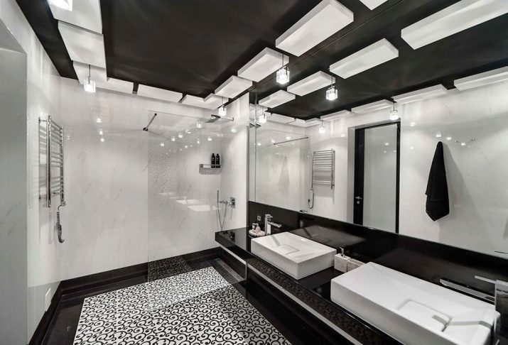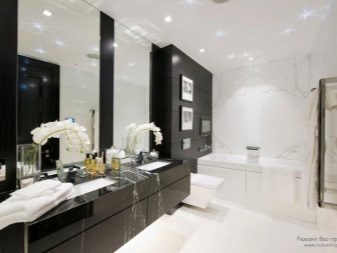 This photo shows how pleasant a large bathroom in black and white can be. To create the necessary color combination used the usual tiles. Using mirrors and local lighting immediately made the interior more interesting.It is immediately clear that the room is decorated in a modern spirit.