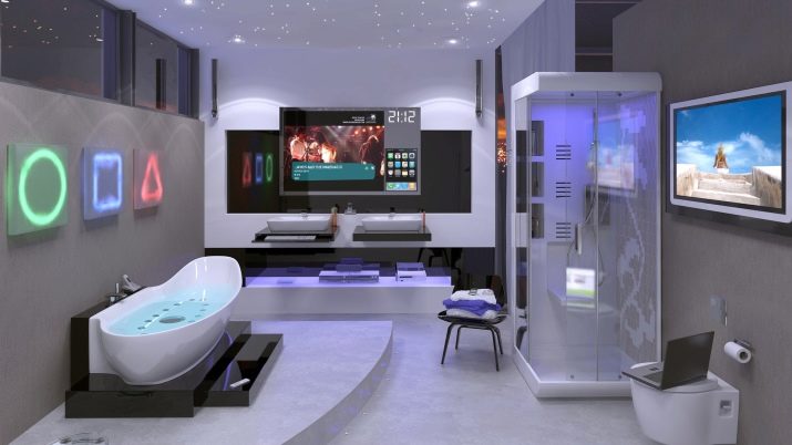Techno stylistics will delight those who do not value esthetics and comfort too much. This moment is perplexing when it comes to the bathroom. The characteristic features of the design will be the severity of the contours and a slight shade of visual rudeness. But black and white can be used in ethnic design. "African" style can be expressed in the use of clear stripes.