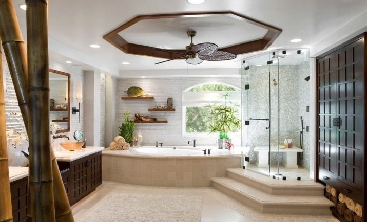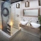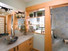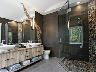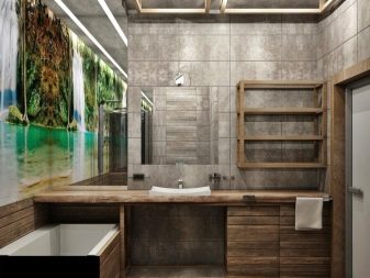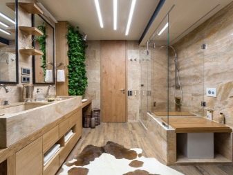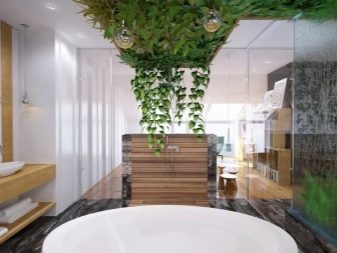 Eco style especially appreciated by lovers of natural materials and everything natural. The thing is that even when decorating the bathroom, ceramic tiles with a print that imitates wood colors, a large number of artificial greens or accessories of the appropriate tone, as well as elements made of natural wood impregnated with moisture-resistant compounds are used. But it is worth considering that any compounds lose their properties over time, therefore it is not recommended to use wood in a large volume and objects from such material should be placed as far away as possible from water.