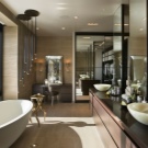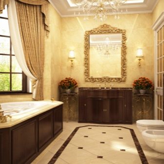 - A sophisticated design in beige and brown tones will appeal to lovers of comfort, and a large amount of free space will allow you to combine a bath and shower area. The space of such a room is ideal for a private house, but in an apartment it can be used with greater benefit.