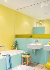 - Such a room will be beautiful and unusual in a light lemon tone. Usually it is combined with white, light gray and light menthol colors, and the design in such cases is presented in the form of integral paintings and unobtrusive drawings on a marine or natural theme.