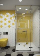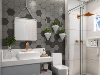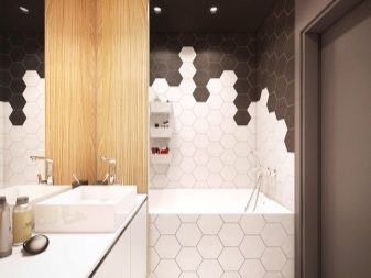 It is worth noting that You can create a rather original version of the design with ceramic tiles by choosing products of an unusual shape. The most common elements in the form of bee honeycombs. You can pick up monophonic tiles and lay out all the walls with such honeycombs, or you can also make a spectacular and original ornament.