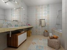 In the design of textiles, this is done through the use of various colored patches, and in the interior of the bathroom, a mischievous achromatic palette is laid out from small plain tiles or from parts with different prints.