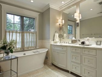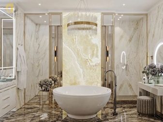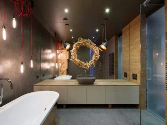 therefore in addition to the central lighting fixture and spotlights, you can also complement the interior with elegant wall sconces and functional lamps, located in the area of the mirror.