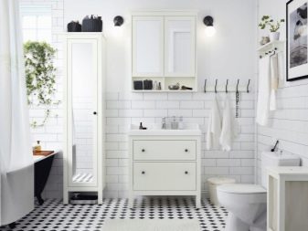 In most cases, preference is given to products. in neutral colors - white, beige, powdery and light brown. If you want to somehow add to the interior of a standard bathroom, you should follow the recommendations of designers and pay attention to furniture from the Swedish brand IKEA, whose assortment contains quite original models of toilet wall mounted lockers with a mirror and narrow cabinet-cases with doors and without them. Particularly noteworthy is the model, the frame of which is made in the form of sophisticated iron castings.