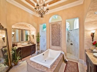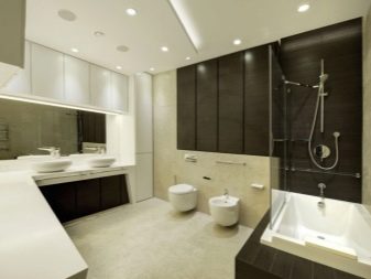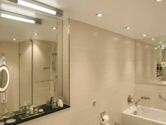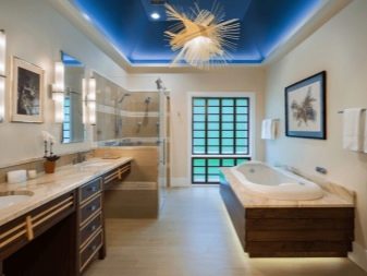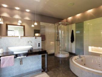 A medium-sized room can also be equipped with spotlights, increasing their number to 8-10 pieces. But there are options for combining the central device and the above-mentioned fixtures, placing 2 pieces in separate areas of the ceiling surface, for example, above a bathtub or sink. A large and spacious bathroom needs a special lighting system.