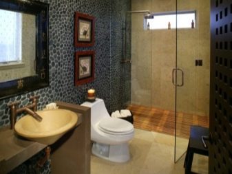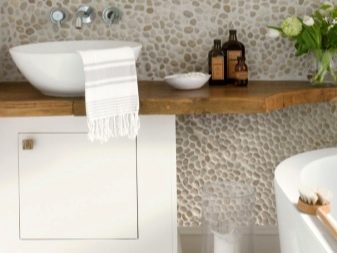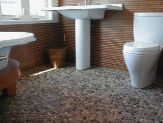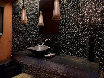 For those who want to make the interior of their bathroom more original and unusual, there are many other finishes. For example, a tile with a transparent mesh base and ceramic stones in the form of pebbles will look like real masonry. On the walls, such decoration will be appropriate only in the form of decor in combination with plain tiles, but in the outdoor version it will resemble the seashore.