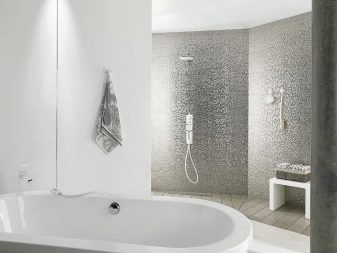 - Silver tile It looks quite organically in the interior of the bathroom, even with the full design of the walls. The main thing is to choose a light tone, since saturated will look hard and even vulgar. In addition, the silver color will be very successfully combined with lilac, turquoise, menthol, light yellow and white.