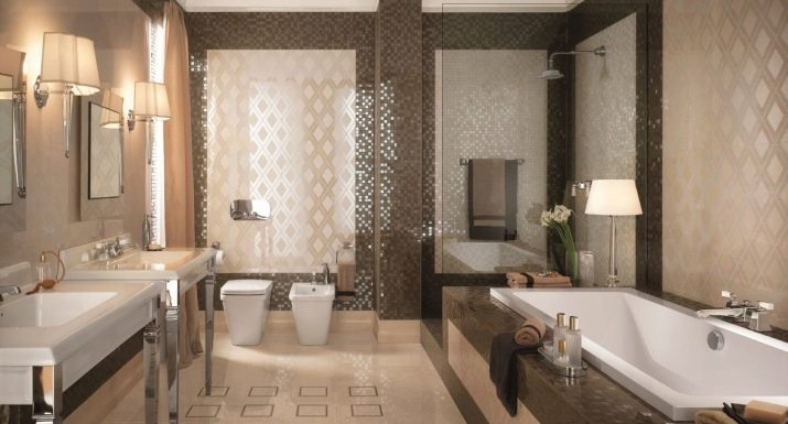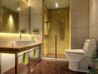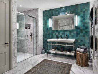 Fortunately, modern technologies make it possible to produce inexpensive materials whose appearance will be almost identical to the design of luxury tiles. In the modern design of the bathroom, floor tiles of large sizes are most often used, as well as rather large wall materials of a rectangular shape.Much less commonly, standard square tiles of small parameters are used, but decorative mosaics are actively used, ideal for decorating one of the walls of the room or its separate part.