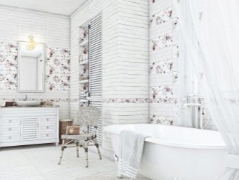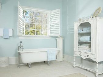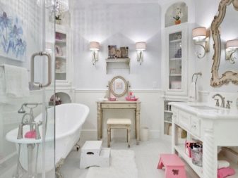 Shabby chic It is something incredibly sophisticated and elegant. That is why the interior of the bathroom in this style will become the unconditional choice of a dreamy romantic nature. This style is characterized by the use of white as the main color in the interior, the presence of light floral prints in the form of small drawings, as well as the addition of the overall picture with details of muted light shades.