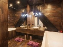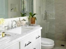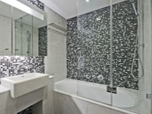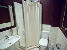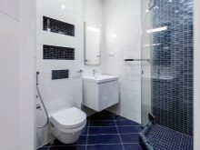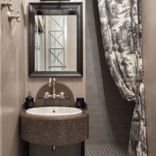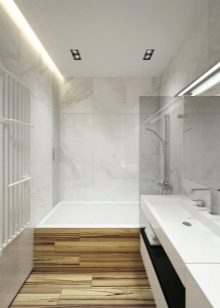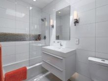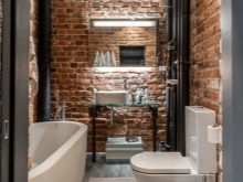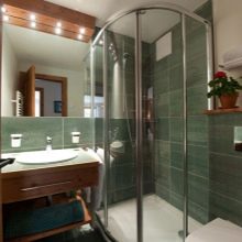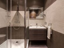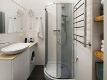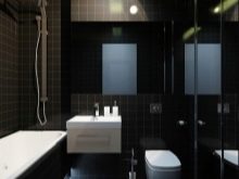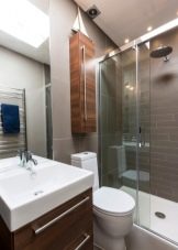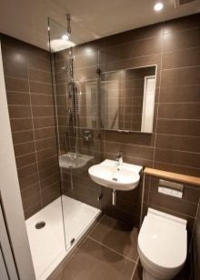 For such a solution, showers are optimal - strict and modern, without backlight and "bells and whistles". Next to it, you can place a compact heated towel rail, a small metal sink. For the design of walls suitable tiles "marbled". The mirror does not need a frame.